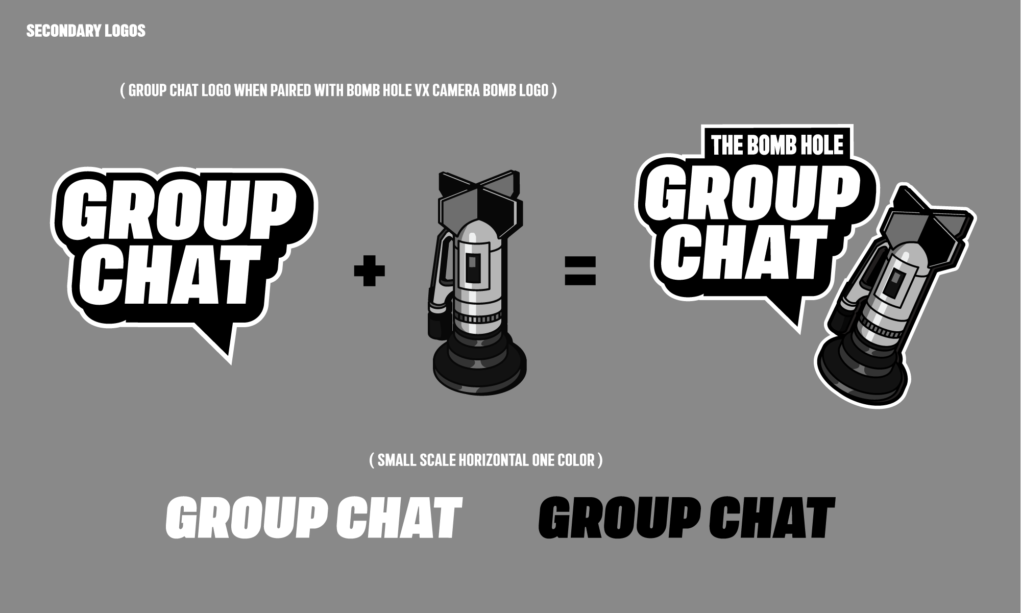 When developing the brand identity for Group Chat, The Bomb Hole’s design elements were emphasized to unify the two identities. The colors, along with the bold, simplistic outlined graphics and typography, are key features of The Bomb Hole that were carried forward. Central to this new identity, the logo was designed to capture the essence of the show's casual, conversational format and differentiate it from the primary platform. While incorporating similar visual elements, Group Chat required a unique design system for its promotional materials and thumbnails to set the two identities apart.